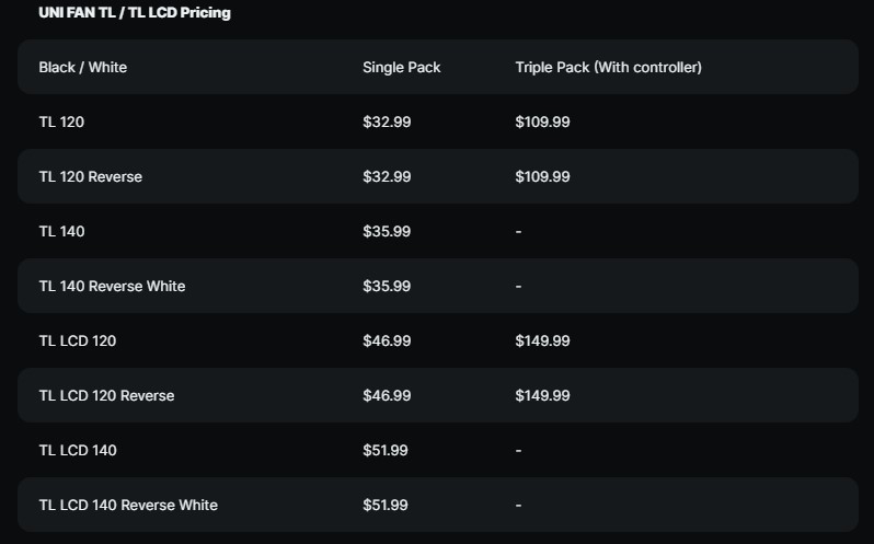 Os preços dos novos itens podem ser encontrados na tabela abaixo. Você pode encomendar ventiladores Lian Li UNI FAN TL e UNI FAN TL LCD a partir de hoje.