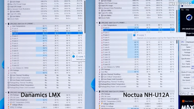 O entusiasta testou a eficácia do sistema de refrigeração Danamics LMX em testes sintéticos e de jogos. Para efeito de comparação, der8auer pegou um cooler de ar para CPU Noctua NH-U12A normal com uma ventoinha de 120 mm. O sistema de teste foi baseado no principal processador Intel Core i9-12900KS.