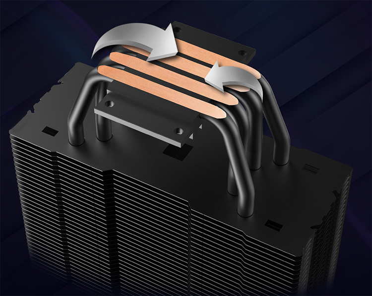 Quatro tubos de calor em forma de U de 6 mm de diâmetro passam pelo radiador de alumínio. São fabricados com tecnologia HDT, que proporciona contato direto com a tampa do processador.