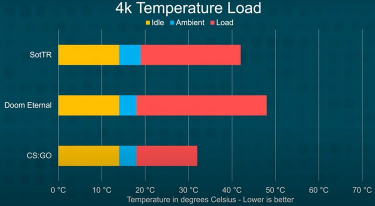 No modo inativo, a temperatura do CPU variava de 0 a 15 graus Celsius, enquanto sob carga, apesar de um overclock muito alto, não chegava nem a 50 graus Celsius. O load foi jogado pelos jogos Shadow of Tomb Rider, DOOM Ethernal e Counter Strike: Global Offensive em resolução 4K.