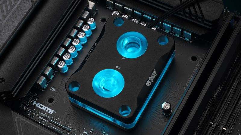 A marca Thermal Grizzly, conhecida por suas interfaces térmicas, oferece aos clientes blocos de água incomuns projetados para resfriar processadores que não possuem uma tampa dissipadora de calor padrão. O produto Intel Mycro Direct-Die RGB Pro V1 é um desenvolvimento evolutivo do water block anterior da série, superando-o em eficiência de resfriamento.