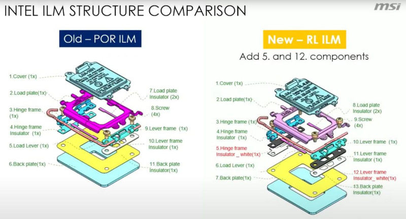 Para o novo soquete do processador LGA 1851, a Intel possui dois tipos de montagem. Um design mais moderno é denominado RL-ILM. Este tipo de ILM proporciona melhor contato e menos flexão em comparação com o antigo tipo POR-ILM.
