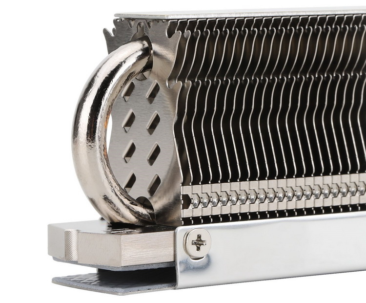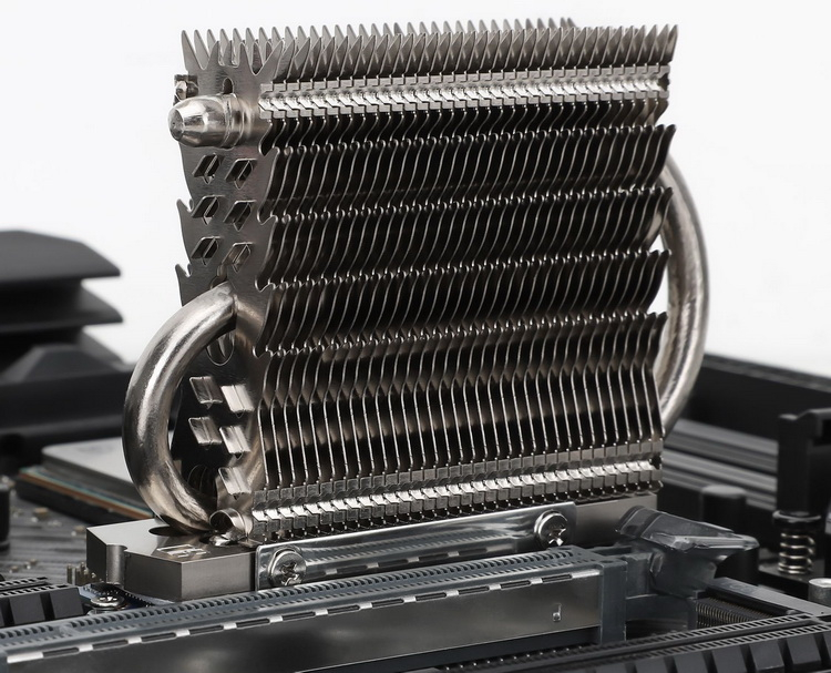 A construção do Thermalright HR-09 Pro consiste em uma base de cobre niquelado, dois tubos de calor de 6 mm e um total de 66 aletas de alumínio.