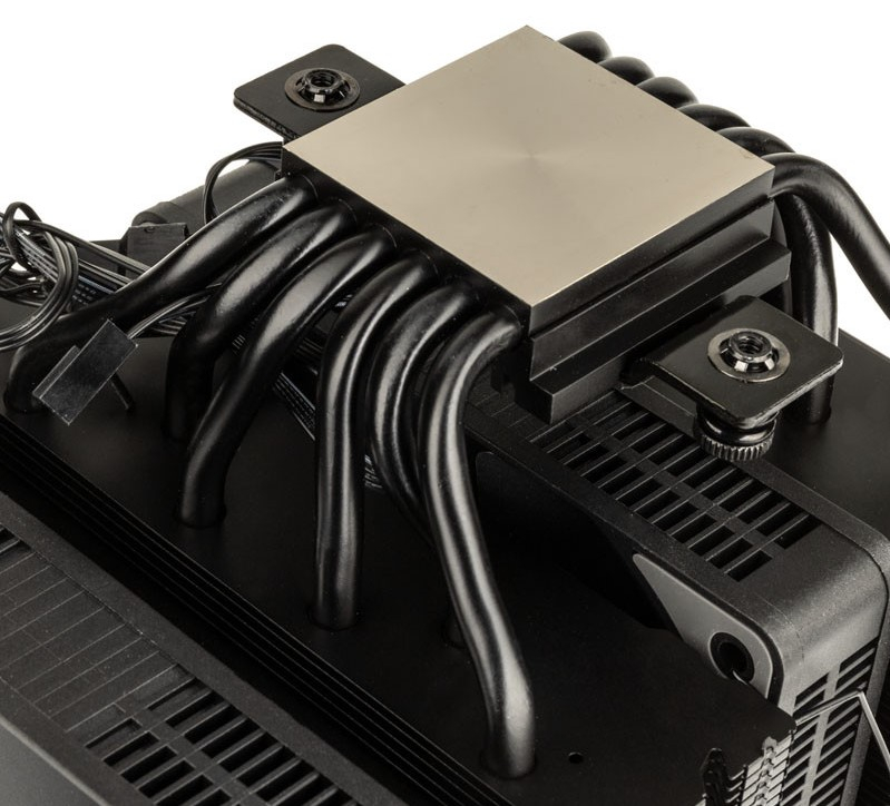 A base do cooler é feita de cobre niquelado. O radiador de torre dupla inclui seis tubos condutores de calor com diâmetro de 6 mm. Um par de ventoinhas de 120 mm com velocidades de operação de até 1500 rpm são responsáveis pelo resfriamento dos radiadores. Eles criam uma pressão estática de 2,05 mm de água. Arte. e ter um nível de ruído não superior a 35,3 dBA.