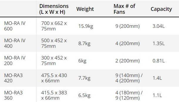 Todos os radiadores MO-RA IV têm 75 mm de espessura e suportam ventoinhas de 200 mm. O MO-RA IV 200 suporta a instalação de duas ventoinhas de 200 mm, o MO-RA IV 400 suporta até quatro dessas ventoinhas e o MO-RA IV 600 oferece a instalação de nove spinners de 200 mm. Além da enorme capacidade de refrigeração, os novos produtos possuem design modular. Isso significa que eles podem ser colocados em praticamente qualquer lugar – conectados a um gabinete de computador (você precisará de um gabinete muito grande), colocados de forma independente em suportes ou até mesmo pendurados na parede.