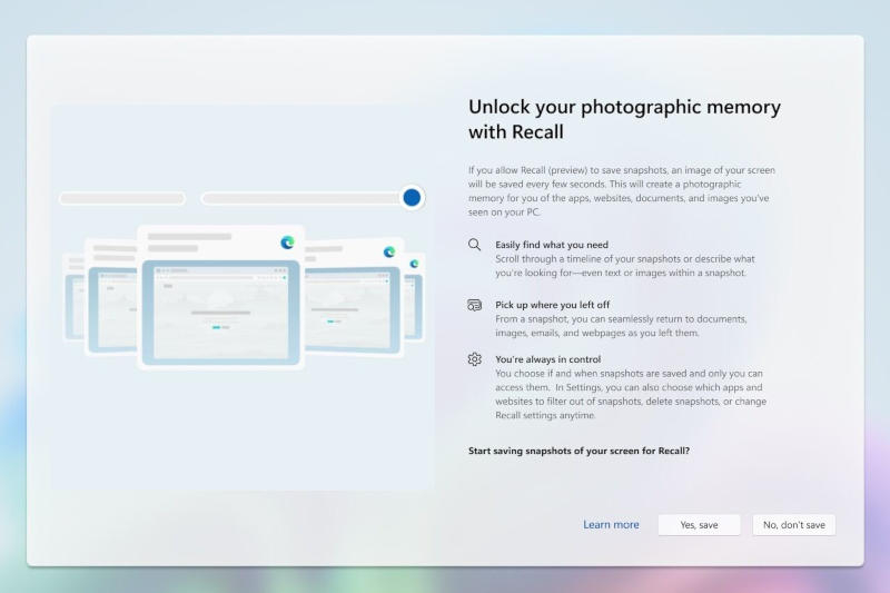 Recall possui uma ampla lista de requisitos de sistema. O recurso funciona apenas em um PC Copilot+ executando Windows 11 que usa criptografia de dispositivo com BitLocker, TPM 2.0, proteção de integridade de código baseada em virtualização, inicialização medida, System Guard e proteção DMA de kernel. Por padrão, o Recall está desabilitado e requer interação do usuário para iniciá-lo. Durante a configuração inicial do Windows, uma solicitação para iniciar a função e dois botões aparecem na tela: para confirmar seu lançamento ou rejeitá-lo. Neste último caso, o Recall está desabilitado, mas não excluído do computador; Se o usuário de alguma forma perder esta solicitação, o recurso permanecerá desabilitado por padrão.