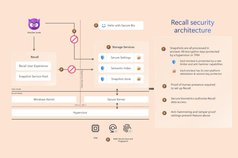 O usuário tem a oportunidade de remover o Recall do PC a qualquer momento. O recurso é mostrado no menu Recursos avançados e não deve aparecer novamente durante a instalação de atualizações. O recall está vinculado ao login seguro do Windows Hello; Todas as imagens e informações associadas são armazenadas criptografadas em um banco de dados vetorial. As chaves de criptografia são protegidas por TPM, e o acesso a elas é aberto apenas através do VBS Enclave (Virtualization-based Security Enclave) – se vários usuários trabalharem na mesma máquina, um não conseguirá monitorar o outro, mesmo que faça login em seu conta, pois os dados recolhidos são protegidos por biometria. Os serviços relacionados a recursos são isolados e protegidos contra malware. A Microsoft também tomará medidas para limitar a velocidade de autenticação e prevenir hackers.