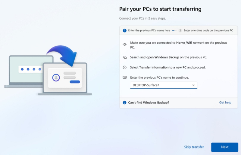 Para usar o novo recurso de migração, o usuário precisa abrir o aplicativo de backup do Windows no computador antigo e selecionar “Mover informações para o novo computador”. Em seguida, o nome do computador será exibido na tela (por exemplo, DESKTOP‑Surface7). No novo computador, você precisará especificar o nome do PC antigo e inserir um código de seis dígitos, após o qual os dispositivos entrarão em modo de pareamento.