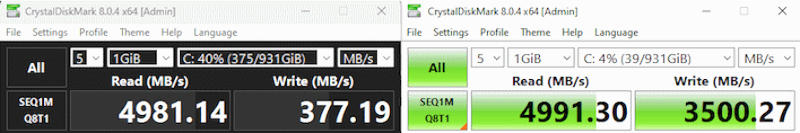 Diferença no desempenho de leitura e gravação no Windows 11 (à esquerda) e no Windows 10 (à direita) no mesmo computador. Fonte da imagem: hothardware.com