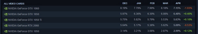 As cinco placas de vídeo mais populares não mudaram. O acelerador mais usado na plataforma Steam ainda é a GeForce GTX 1060. No entanto, continua perdendo popularidade. Sua participação em abril diminuiu 1,03 ponto percentual e é de 7,15%. Em segundo lugar está a GeForce GTX 1650 com participação de 6,48% (+0,40 p.p.), e em terceiro lugar está a GeForce GTX 1050 Ti com participação de 5,63% (+0,10 p.p.). O top cinco é fechado pela GeForce RTX 2060, que é usada por 5,09% dos usuários do Steam, assim como pela GeForce GTX 1050. Esse modelo de placa de vídeo na plataforma é usado por 2,99% dos jogadores.