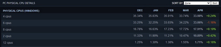 É curioso que em um mês os chips de seis núcleos tenham perdido a liderança no segmento de processadores, que em março pela primeira vez conquistou a primeira linha de popularidade na plataforma. De acordo com os resultados de abril, sua participação caiu de 34,22% para 33,06% (-1,16 ponto percentual).