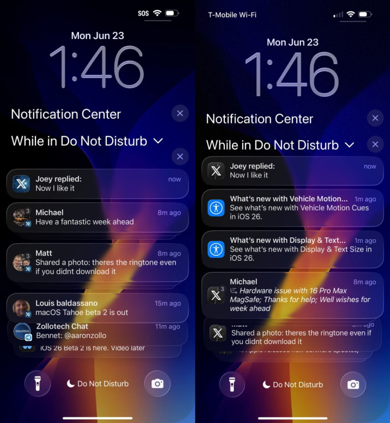 As notificações no primeiro beta também foram criticadas pelo mesmo motivo. Na nova versão, a Apple tornou o texto mais contrastante, melhorando a legibilidade. No entanto, as notificações ainda precisam de alguns ajustes, especialmente em fundos claros ou brilhantes.