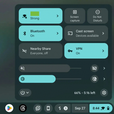 O ChromeOS 117 estável usa a filosofia de design Material You do Google, que apareceu no Android 12 em 2021. A mudança mais notável está na seção Configurações rápidas, que agora são mais fáceis de ler e selecionar graças aos botões retangulares maiores que substituem pequenos ícones redondos.