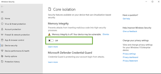 Desative a integridade da memória. Fonte da imagem: Microsoft
