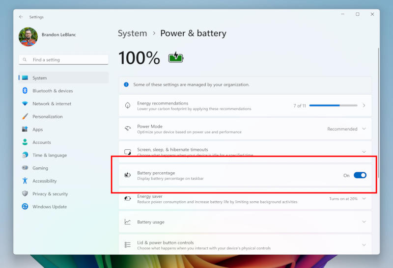 Ícones de bateria coloridos e atualizados aparecem na barra de tarefas, no menu suspenso Configurações rápidas e nas configurações gerais do Windows. Em uma das versões futuras, esse indicador também será usado na tela de bloqueio. A Microsoft também melhorou o posicionamento do ícone de raio adicional que aparece quando o carregador está conectado, para que o ícone não obscureça mais o nível de carga da bateria. Também agora, ao lado da imagem da bateria, ao habilitar a opção correspondente nas configurações, seu nível de carga é mostrado em porcentagem.