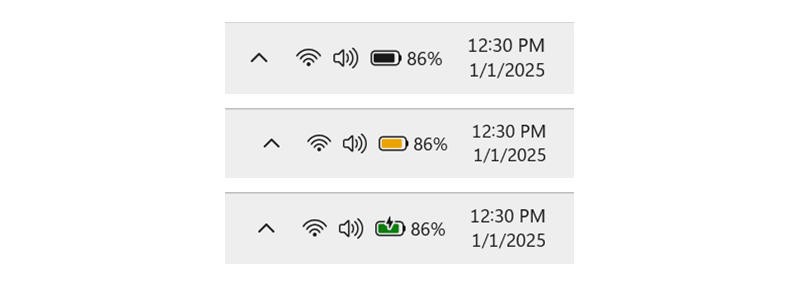 O ícone da bateria do Windows, que tradicionalmente era preto, agora pode ter uma das três cores dependendo do nível da bateria. Desta forma, o usuário pode avaliar rapidamente o status da fonte de energia autônoma. Quando o nível de carga está alto ou um carregador está conectado, o ícone fica verde; se estiver amarelo, significa que o computador está funcionando no modo de economia de energia, que liga automaticamente quando o nível está abaixo de 20%; vermelho significa “nível de bateria criticamente baixo”.