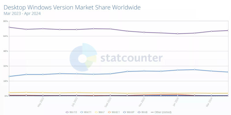 No ranking global do Statcounter, a plataforma Windows 11 apresentou queda pelo segundo mês consecutivo – sua popularidade entre os usuários de todo o Windows caiu para 25%, enquanto o Windows 10 voltou a atingir 70%. Desde o seu lançamento em outubro de 2021, o sistema operacional mais recente da Microsoft teve um crescimento lento, mas constante, terminando em 28,16% em fevereiro. Desde então, perdeu cerca de 2,5 pontos percentuais.