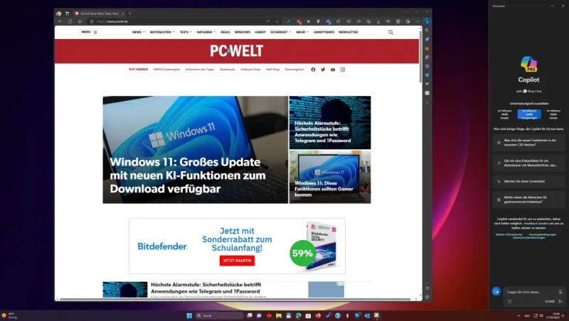 A atualização do Moment 4 traz muitas inovações e é a mais extensa desde o lançamento do Windows 11. Em primeiro lugar, vale destacar o surgimento de uma versão prévia do assistente de IA Copilot, que torna a plataforma de software da Microsoft o primeiro sistema operacional para que os computadores recebam suporte centralizado para tecnologias baseadas em redes neurais. Esta versão dá ênfase especial a uma interface de usuário integrada. Para começar a trabalhar com o assistente de IA, basta clicar no ícone do Copilot na barra de tarefas ou iniciá-lo com a combinação de teclas Win+C. O Copilot no Windows aparece como uma barra lateral localizada no lado direito da área de trabalho. Ele pode ser usado para realizar diversas ações no sistema operacional, como ativar um tema escuro, fazer capturas de tela, etc. Também pode tirar dúvidas dos usuários, gerar textos a partir de dicas, buscar informações na Internet, etc.