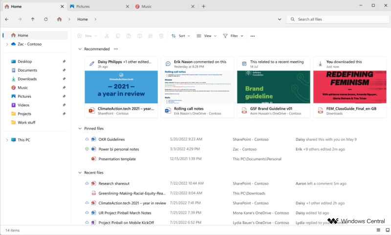 O Moment 4 traz consigo um Explorer modernizado. Ao utilizar uma conta Azure, os ficheiros recomendados são apresentados no Explorador de Ficheiros como um carrossel. Se necessário, esta opção de exibição pode ser desativada e substituída por pastas fixadas no menu. A barra de endereço do Explorer aprendeu a reconhecer pastas locais e na nuvem. Além disso, apareceu um novo painel de informações, que pode ser acessado pressionando a combinação de teclas Alt+Shift+P. Isso o ajudará a acessar os arquivos de seu interesse, bem como informações relacionadas sobre eles. Um diretório também foi adicionado ao Explorer, permitindo acessar rapidamente a coleção de fotos de um usuário. Se você usar o recurso de backup de fotos do smartphone para o OneDrive, as fotos tiradas no seu dispositivo móvel também serão exibidas aqui.