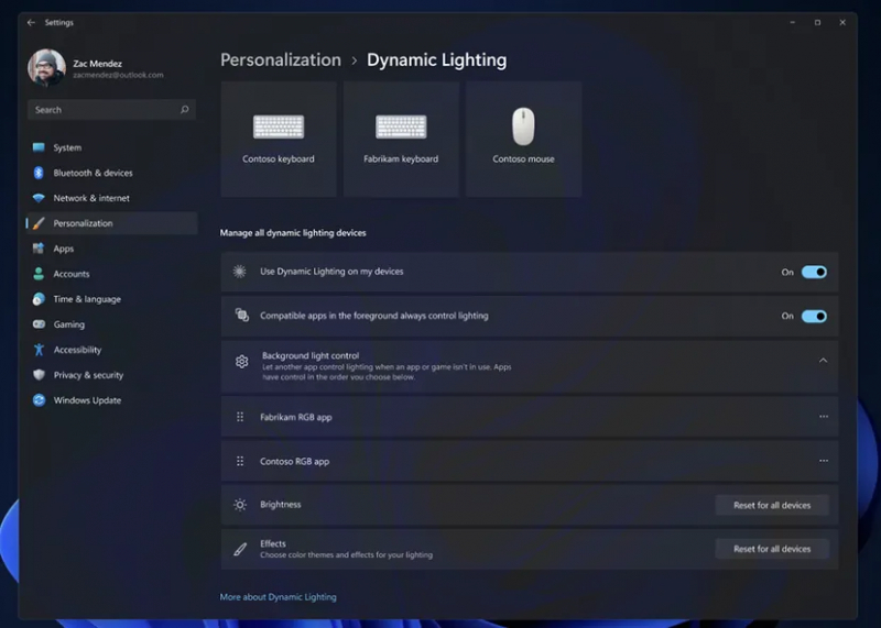 Os testadores do Windows 11 podem experimentar uma implementação inicial de iluminação dinâmica, mas a Microsoft alerta que há vários problemas com dispositivos sem fio, portanto, conexões com fio são recomendadas por enquanto. Uma ampla variedade de teclados e mouses Razer são atualmente suportados. O suporte para periféricos ASUS estará disponível em breve.