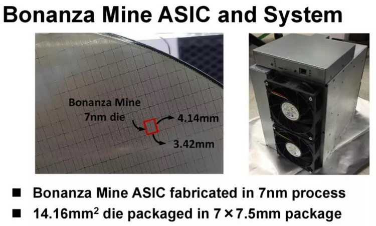 O chip Bonanza é feito em um processo de 7nm (provavelmente TSMC, mas isso não é certo), e tem dimensões de apenas 4,14 × 3,42 mm, o que dá uma área de 14,16 mm2. Devido à pequena área do chip, é possível usar a área do wafer de silício ao máximo – até 4000 cristais podem ser obtidos a partir de um substrato de 300 mm. O ASIC é embalado em um pacote BGA medindo apenas 7×7,5 mm, que é menor do que muitos chips de RAM DDR4 no mesmo tipo de pacote.