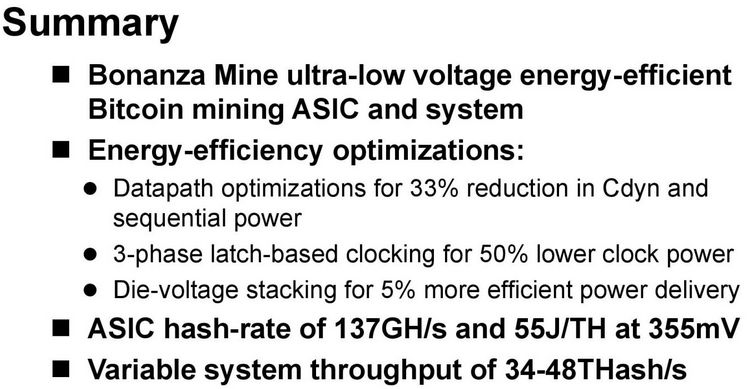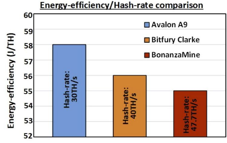 Cada chip Bonanza possui 258 blocos de mineração, cada um processando duas funções SHA256 em paralelo. Esses blocos ocupam 90% da área do cristal. Os chips operam em uma frequência de 1,35-1,6 GHz e a tensão nominal é de apenas 355 mV, na qual o desempenho de um único chip é de 137 gigahash/s. Isto dá uma eficiência energética de 55 joules por terahesh e uma eficiência energética de pico de 20 joules por terahesh a 290 mV.