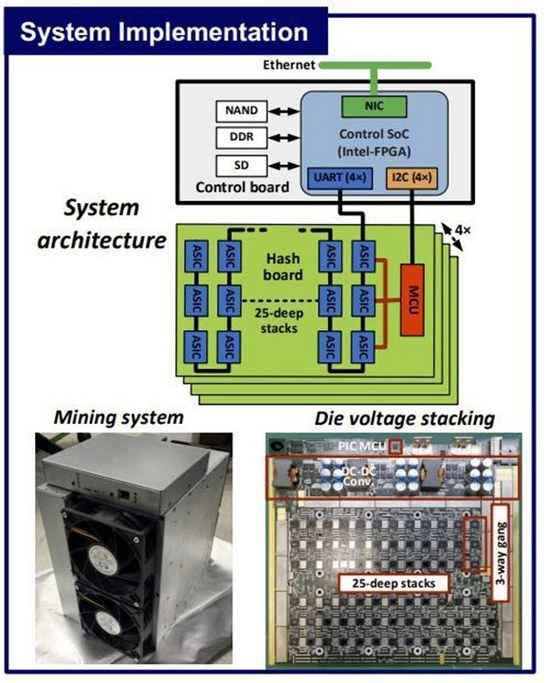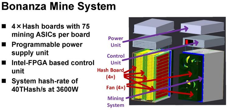 O sistema apresentado pela Intel consiste em quatro placas de circuito impresso, cada uma contendo 75 chips Bonanza. A unidade de controle baseada no FPGA desenvolvido pela própria Intel com o núcleo Arm Cortex é responsável por seu trabalho bem coordenado. Esse núcleo é responsável pelo funcionamento do software de mineração, e pela distribuição de cargas entre ASICs e pela verificação dos valores emitidos por eles. O barramento UART com velocidade de 10 MB/s é responsável pela comunicação entre o módulo de controle e as placas com ASICs. O controlador Ethernet é responsável pela conexão de rede. Observe também a presença de uma fonte de alimentação programável.
