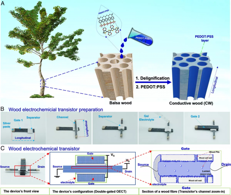 Para criar o WECT, os pesquisadores precisavam de madeira condutora (CW). É obtido removendo a lignina da madeira usando um solvente químico. Posteriormente, os canais nos quais a lignina estava presente são substituídos por um polímero com condutividade eletrônica-iônica mista. Neste projeto, as madeiras escolhidas foram a balsa (devido à desejada estrutura interna do canal) e o polímero condutor PEDOT:PSS. Três segmentos de CW foram usados para construir o VET: um como o canal central do transistor e um como os portões superior e inferior.