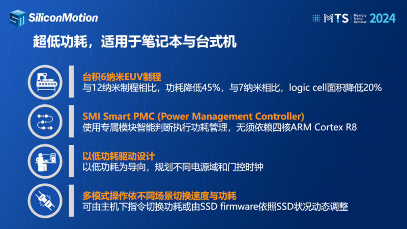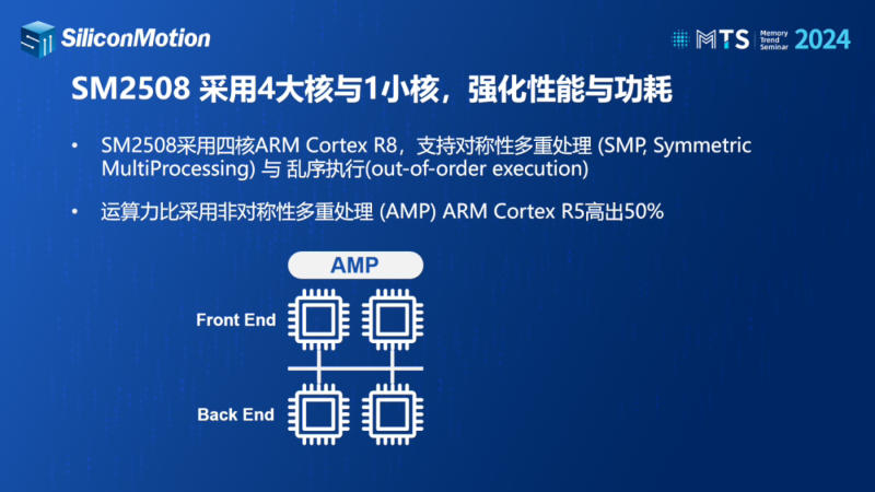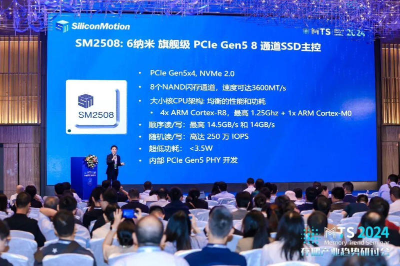 Tendo feito um anúncio preliminar no evento Flash Memory Summit 2023, a Silicon Motion revelou agora detalhes sobre o futuro controlador SM2508 no evento Memory Trend Summit 2024. Desde a cúpula, a taxa nominal de transferência de dados do controlador aumentou ligeiramente: agora é é 14,5 GB/s para leitura sequencial e 14,0 GB/s para gravação, embora anteriormente declarado 14 GB/s para ambos. O controlador continua a oferecer desempenho de até 2,5 milhões de IOPS e suporta memória flash 3D TLC/QLC NAND.