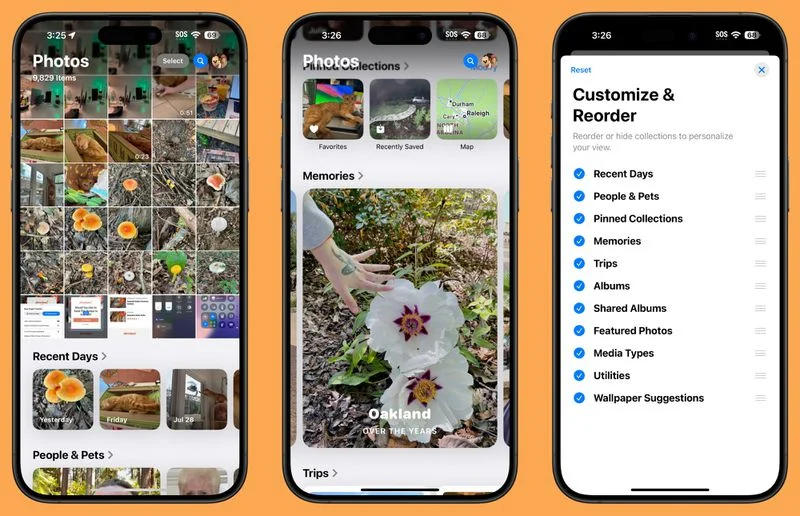A Apple respondeu aos comentários dos primeiros usuários do novo aplicativo Fotos e fez alterações adicionais no design. Em particular, removeu o carrossel que permitia percorrer diferentes coleções de fotos da grade principal de fotos, tornando o aplicativo menos confuso e sem elementos duplicados. Ao ser aberto, uma grade de fotos é exibida na tela, mas agora são mais; Você também pode rolar a grade para baixo para acessar as coleções. Os usuários com vários álbuns os verão em uma posição superior no aplicativo, e o conteúdo salvo recentemente agora está integrado à coleção dos Dias Recentes. A ordem de exibição das coleções pode ser alterada.