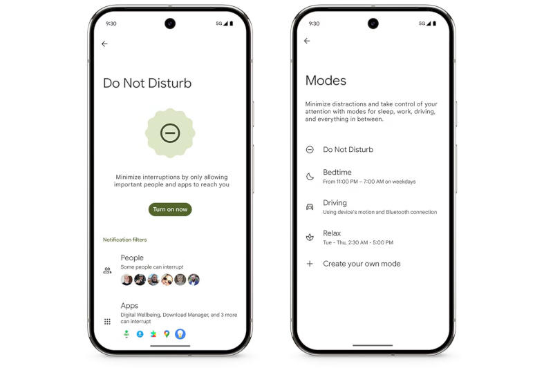 O novo menu Modos oferece acesso rápido e fácil aos formatos de notificação que podem mudar com base no seu ambiente, agenda ou eventos do calendário. As configurações do modo são definidas na seção Notificações do aplicativo de configurações do telefone. Os smartphones da série Pixel 9 do Google agora têm a capacidade de enviar mensagens de texto de emergência via satélite quando as redes terrestres não estão disponíveis. Este recurso agora está disponível na maior parte dos Estados Unidos para assinantes da T-Mobile e da Verizon, com exceção de algumas áreas do Alasca. Comunicações de emergência via satélite também foram implantadas no Canadá, na Europa e no Reino Unido. O Google prometeu que o serviço permanecerá gratuito por dois anos após a primeira ativação do dispositivo.