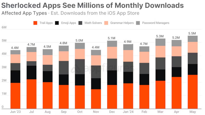 Os aplicativos de viagens acabaram sendo os mais lucrativos – no ano passado, eles renderam aos desenvolvedores US$ 307 milhões, e o mais popular foi o AllTrails, que recebeu o status de “aplicativo do ano” em 2023. Assistentes de gramática e matemática arrecadaram US$ 35,7 milhões e US$ 23,4 milhões, respectivamente, a receita de gerenciadores de senhas foi de US$ 20,3 milhões e aplicativos para criação de emojis personalizados geraram US$ 7 milhões. Como resultado das ações da Apple, 78% da receita perdida poderia vir de aplicativos de viagens. — serão responsáveis por 40% das perdas em número de downloads. Para compreender a verdadeira escala do que está a acontecer, só em maio de 2024, estas aplicações representaram aproximadamente 28,8 milhões de dólares em receitas e 2,5 milhões de downloads.