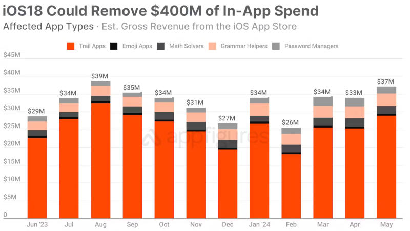 A Apple tende a integrar recursos oferecidos por software de terceiros no iOS e no macOS, o que tem um custo para os desenvolvedores deste último. Com o lançamento do iOS 18, aplicativos cuja receita total é de US$ 393 milhões por ano, e o número de downloads no ano passado atingiu 58 milhões, podem sofrer, relata o TechCrunch, citando um estudo da empresa analítica Appfigures.
