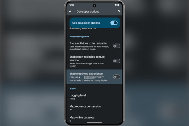 Isso pode mudar com o Android 16. No terceiro beta, o Android Authority encontrou linhas indicando que uma opção “Ativar recursos da área de trabalho” aparecerá em breve nas Opções do desenvolvedor. Eles funcionarão em monitores externos ou também no próprio dispositivo. No código da plataforma, esse modo é chamado de Desktop View, mas o nome pode mudar antes do lançamento público.