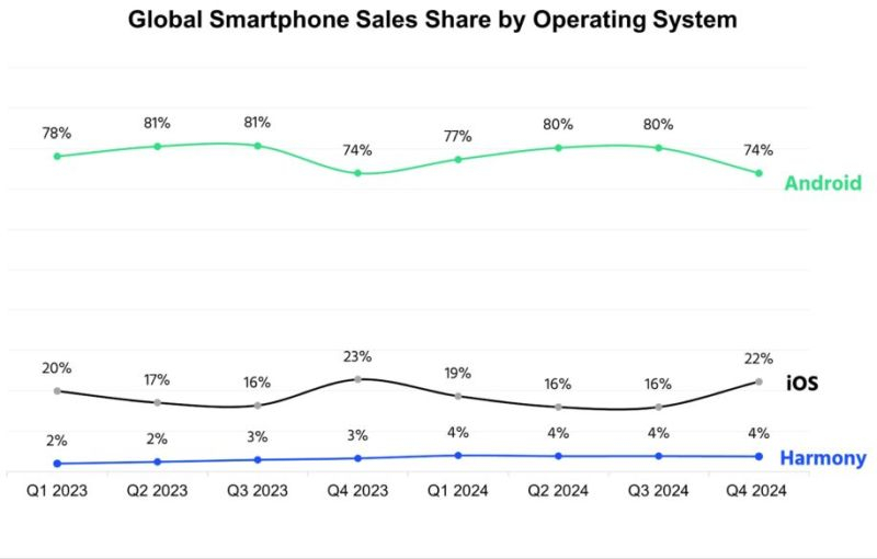 Sob sanções dos EUA desde 2019, a gigante chinesa Huawei Technologies foi forçada a lançar seu próprio sistema operacional, o HarmonyOS, mas sua adoção fora da China foi limitada. No entanto, no mercado doméstico, no último trimestre, ele conseguiu ultrapassar o iOS em popularidade, embora ainda seja inferior ao Android.