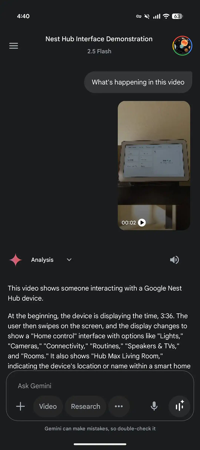 Agora, além de enviar documentos e imagens, os usuários podem adicionar seu próprio arquivo de vídeo à solicitação no aplicativo. O chatbot Gemini AI analisará o vídeo e permitirá que os usuários façam perguntas sobre o clipe. Anteriormente, os usuários só podiam fazer perguntas sobre vídeos na plataforma do YouTube especificando um link para ele.