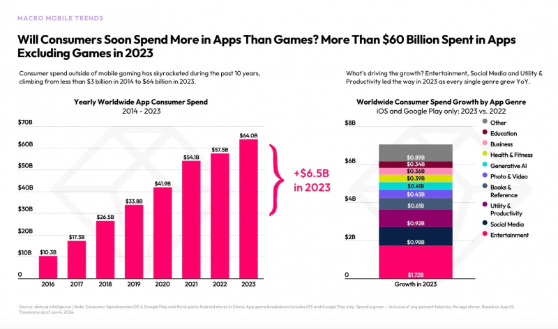 As plataformas de negociação chinesas Temu e Shein entraram nos mercados ocidentais em 2023, garantindo um aumento de 140% na sua popularidade; o tempo gasto em redes sociais e aplicativos de entretenimento cresceu 12%, para 3 trilhões de horas – este último também mostrou um aumento de 10% nos gastos do consumidor, para US$ 29 bilhões. As tendências pós-pandemia continuaram a se desenvolver: o número de downloads de aplicativos de viagens aumentou em 13. % devido a serviços de viagens (26%), serviços de reserva de passeios (80%) e serviços de reserva de passagens aéreas (43%). As vendas de aplicativos de ingressos para eventos aumentaram 31% ano após ano devido aos shows populares de Taylor Swift e Beyoncé, um aumento de 66% em relação aos níveis pré-pandemia.
