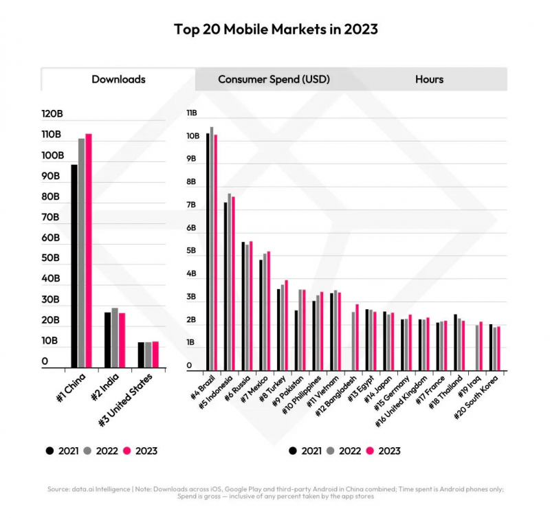 O maior número de instalações de aplicativos ocorreu na China, a Índia ficou em segundo lugar e os Estados Unidos em terceiro; O título de mercado que mais cresce foi para Bangladesh. Na maioria das vezes, eles baixavam utilitários, aplicativos para trabalho, compras, entretenimento, além de fotos e vídeos. Os usuários gastaram um recorde de 5,1 trilhões de horas em aplicativos, um aumento de 6% em relação ao ano anterior. Estima-se que os gastos com publicidade móvel em 2023 tenham crescido 8%, para US$ 362 bilhões, com um salto de 16,2%, para US$ 402 bilhões, esperado em 2024. Nos dez principais mercados, o tempo médio gasto por dia em um dispositivo móvel por usuário aumentou. aumentou 6% desde 2022 e ultrapassou 5 horas – aqui o crescimento foi proporcionado pelo YouTube, WhatsApp, Facebook✴, TikTok, Chrome, Instagram✴ e Netflix.