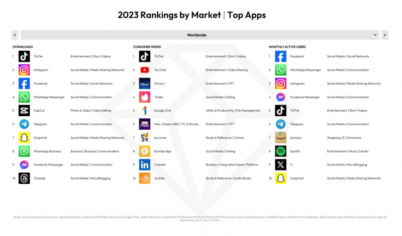 A maior parte do crescimento nos gastos dos consumidores veio de aplicativos não relacionados a jogos, em parte devido ao sucesso do TikTok; O número de downloads de aplicativos permaneceu quase inalterado em 257 bilhões, um aumento de 1% em relação a 2022. O ano de 2022 assistiu a um declínio na economia das aplicações com o fim da pandemia e os factores macroeconómicos forçaram os consumidores a reduzir os gastos.