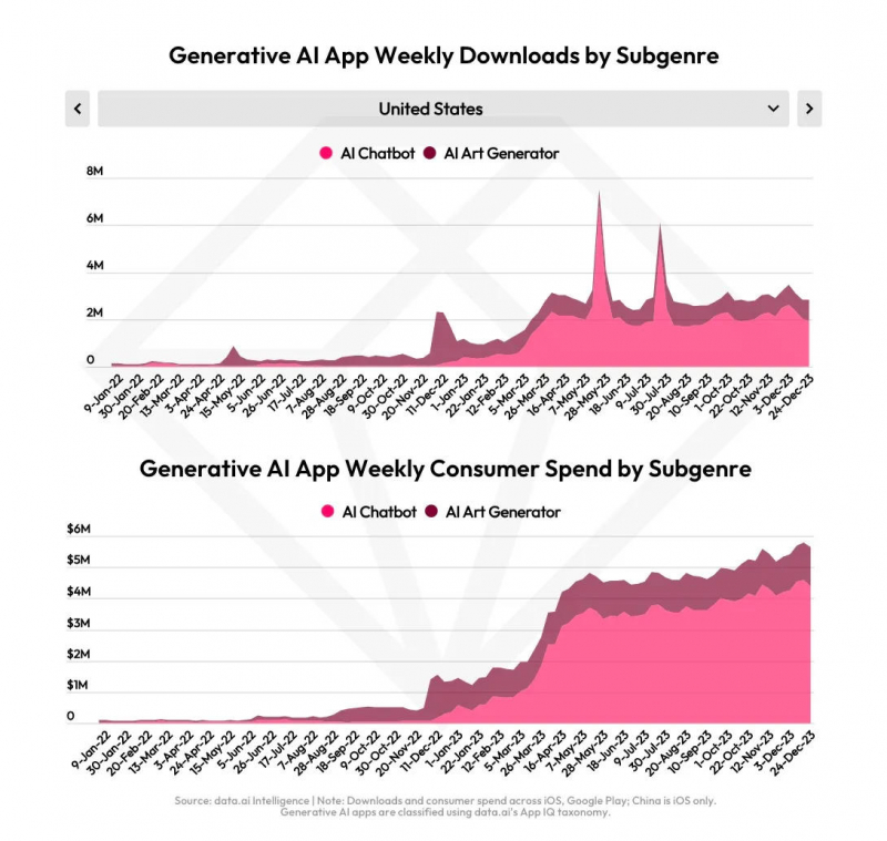 Um dos impulsionadores dos gastos do consumidor foi o segmento de inteligência artificial generativa – o mercado de aplicativos aqui aumentou 7 vezes e surgiram muitos chatbots de IA e geradores de imagens. Em termos de gastos do consumidor, os líderes foram ChatGPT, Ask AI e Open Chat. A popularidade das aplicações de IA cresceu em todo o mundo, mas não ocorreram avanços na China, no Japão, na Arábia Saudita e na Turquia. Muitos desenvolvedores decidiram brincar com a popularidade do tema: nas descrições de 4.000 aplicativos existentes e 2.500 novos, a marca “chatbot” apareceu, outros 3.500 adicionaram a abreviatura GPT à descrição.
