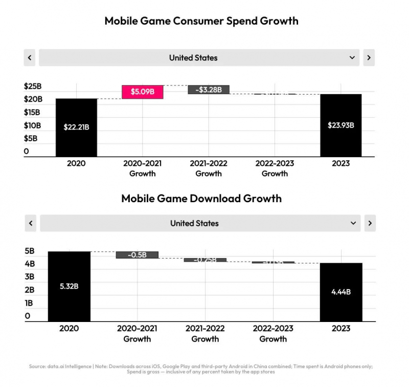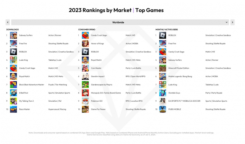 O segmento de jogos para celular afundou em 2023: as despesas do ano diminuíram 2%, para US$ 107 bilhões. O número de downloads de jogos permaneceu quase inalterado – eles foram baixados 88 bilhões de vezes, de um total de 257 bilhões, para todos os aplicativos. Os principais gêneros eram jogos hipercasuais, simulações e jogos de ação. Monopoly GO e EA Sports FC Mobile Soccer fizeram avanços; os gastos totais em Genshin Impact ultrapassaram US$ 4 bilhões. Houve um grande número de downloads de Block Blast Adventure Master, Attack Hole e Avatar Life; o número de downloads de Gacha Life 2 e Eggy Party aumentou.