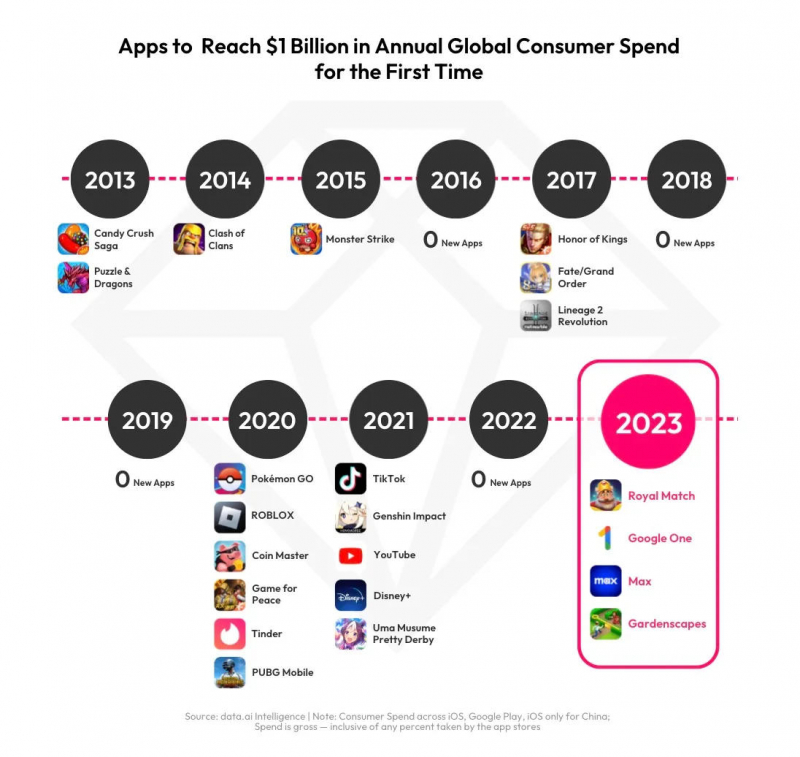 No final de 2023, mais de 1.500 aplicativos geraram receitas anuais de mais de US$ 10 milhões, 219 ultrapassaram a marca de US$ 100 milhões e 13 atingiram a marca de US$ 1 bilhão – quatro deles fizeram isso pela primeira vez: Royal Match, Google One, Max e Gardenscapes.