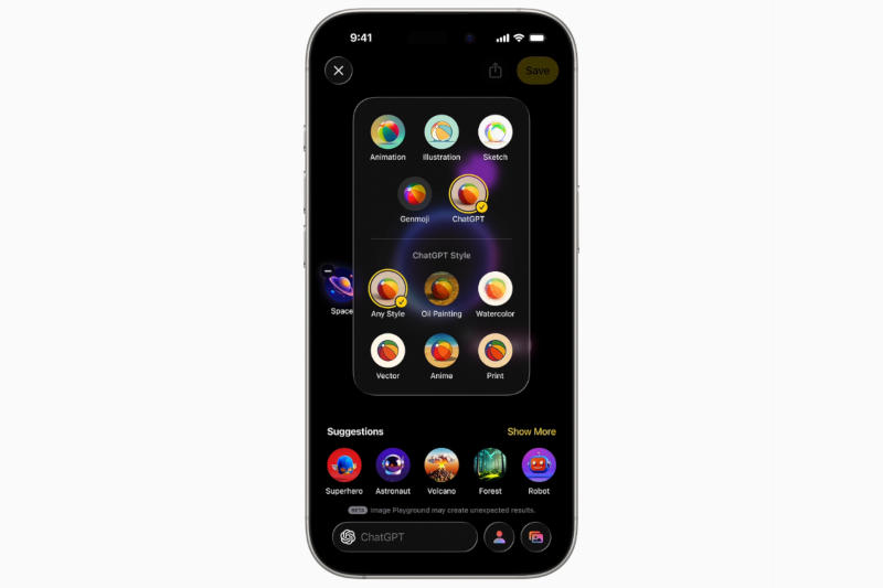 Versões atualizadas do Genmoji e do Image Playground — apenas no iPhone 15 Pro e versões posteriores. No iOS 26, o Genmoji permite criar emojis com base em dois existentes e adicionar descrições de texto à tarefa: você pode escolher as roupas, o penteado e outros aspectos do personagem. O Image Playground suporta a geração de imagens a partir do ChatGPT; os estilos suportados são Anime, Pintura a Óleo, Impressão, Vetor e Aquarela. Há também a opção Qualquer Estilo, que permite descrever qualquer tipo de imagem que você criar.