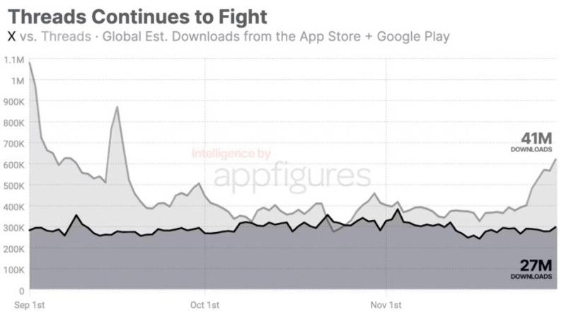 No início de setembro, o número de downloads diários de Threads era de 1 milhão, e de lá até novembro esse número diminuiu: no início do mês chegava a 350 mil, mas em 23 de novembro já havia crescido para 620 mil. Ao mesmo tempo, Threads assumiu a liderança no número de instalações de aplicativos móveis, líder de mercado na pessoa de X: desde setembro, X registrou 27 milhões de novos downloads, e Threads – 41 milhões. Essas estatísticas também incluem uma versão leve do aplicativo para mercados emergentes – Twitter Lite, que ainda não foi afetado pela mudança de marca com a renomeação da plataforma para X. Indicadores que a versão light tem um efeito benéfico nas estatísticas, já que os usuários do Google Play continuam procurando o aplicativo com o antigo nome Twitter .