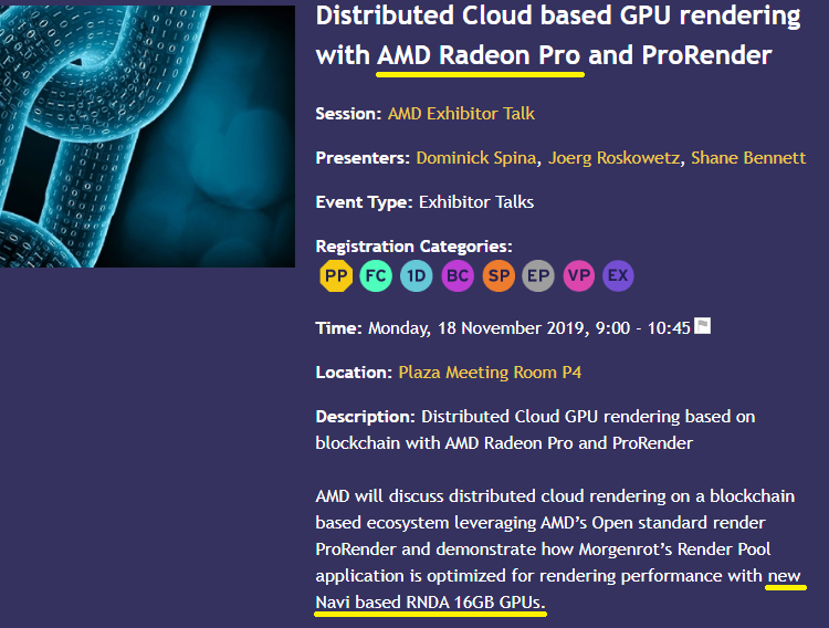 Vale ressaltar que a tecnologia de registros distribuídos (“blockchain”) também está envolvida nesta demonstração, na qual o símbolo da cadeia na ilustração indica claramente. Tudo isso funciona no ambiente ProRender e é explicitamente direcionado a profissionais de computação gráfica. No final da anotação lacônica, chama-se a atenção para a menção de certas novas GPUs da geração Navi com a arquitetura RDNA, adjacentes a 16 GB de memória de um tipo desconhecido.