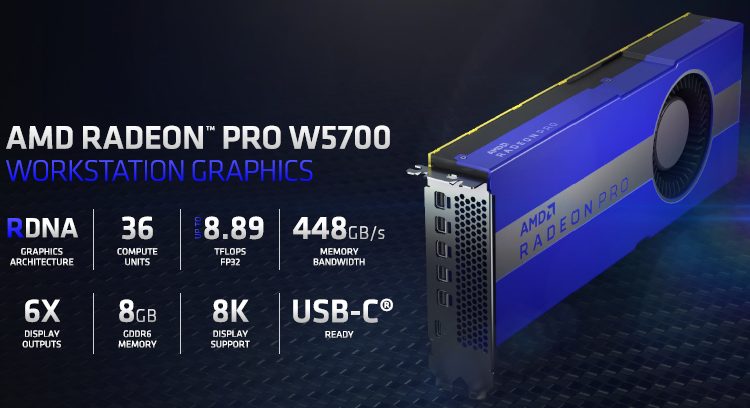 A AMD decidiu comemorar este ano com o lançamento de produtos de 7 nm em todos os principais segmentos de mercado, e o adaptador gráfico profissional com a arquitetura RDNA estava destinado a fechar a série da estreia do ano do aniversário. A AMD nomeou o primeiro Radeon Pro W5700, a primeira placa gráfica profissional de 7 nm do mundo para estações de trabalho. Em geral, o Radeon Pro W5700 é semelhante à versão profissional do Radeon RX 5700, pois este adaptador gráfico é equipado com 8 GB de memória GDDR6, oferece 36 unidades de computação e seis saídas no painel traseiro para conectar o mesmo número de monitores. Além das seis saídas mini-DisplayPort, havia espaço para aberturas de ventilação e uma porta USB-C no painel traseiro. Você pode conectar não apenas monitores compatíveis, mas também fones de realidade virtual.