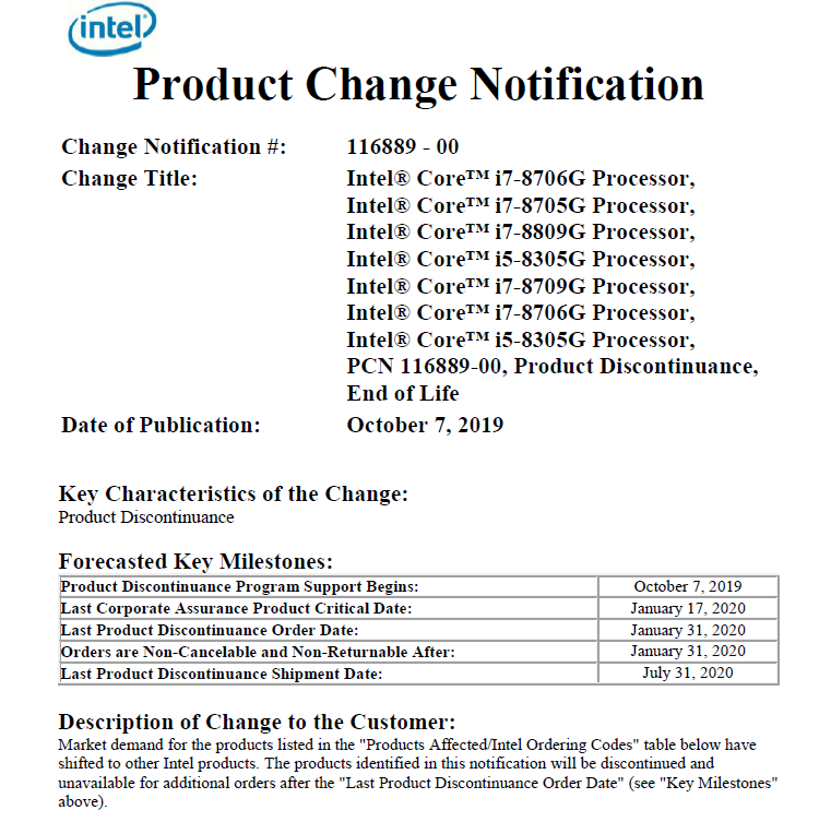 A afirmação média mais uma vez diz que a demanda mudou para outros produtos da Intel. Será possível encomendar processadores móveis da família Kaby Lake-G até 31 de janeiro de 2020, o último lote de processadores será enviado em 31 de julho do mesmo ano. Isso não significa que após a data especificada os processadores não possam ser encontrados à venda. As reservas obtidas pelos parceiros da Intel duram vários anos, mas os processadores móveis geralmente não se enquadram no varejo, pois são principalmente necessários para o reparo de laptops.
