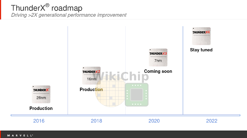 O destino do ThunderX2 era invejável. Inicialmente, o projeto foi desenvolvido nas entranhas da Broadcom, depois passou para as mãos de Cavium, que finalmente absorveu a Marvell. O anúncio dessas CPUs ocorreu em 2016, mas na verdade elas entraram no mercado apenas em 2018. Em tais circunstâncias, não era necessário falar sobre nenhum plano de desenvolvimento. Agora o projeto parece estar em boas mãos – a Marvell está pronta para desenvolver uma série desses processadores ARM do lado do servidor e já anunciou planos para o ThunderX3 e ThunderX4.