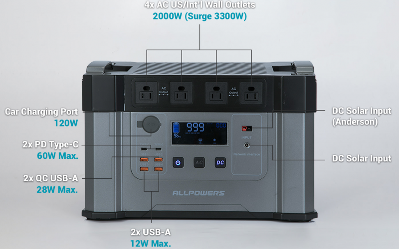 A bateria do ALLPOWERS Monster X 1300 possui quatro soquetes CA (com soquetes americanos ou europeus), um soquete para carro (isqueiro), quatro portas USB tipo A de 12 e 28 W e um par USB tipo C com suporte para fornecimento de energia de até 60 Ter A bateria pode fornecer até 2000 watts de energia para vários dispositivos ao mesmo tempo, o que possibilita o uso do dispositivo para trabalhar com um PC, monitor, TV, console de jogos e outros dispositivos. A capacidade da bateria de 1278 Wh é suficiente para aumentar o alcance do carro elétrico em 7 a 10 km, o que em alguns casos pode ser muito útil.