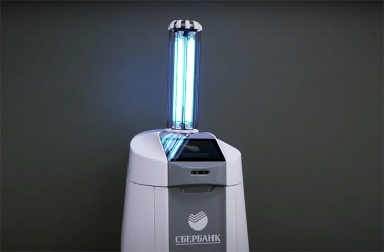 O Sberbank anunciou a criação de um robô de desinfecção este mês. O protótipo possui lâmpadas ultravioletas com uma potência total de 100 W, o que permite desinfetar uma sala de 20 m2 em 5 minutos. No futuro, o poder das lâmpadas pode ser aumentado.
